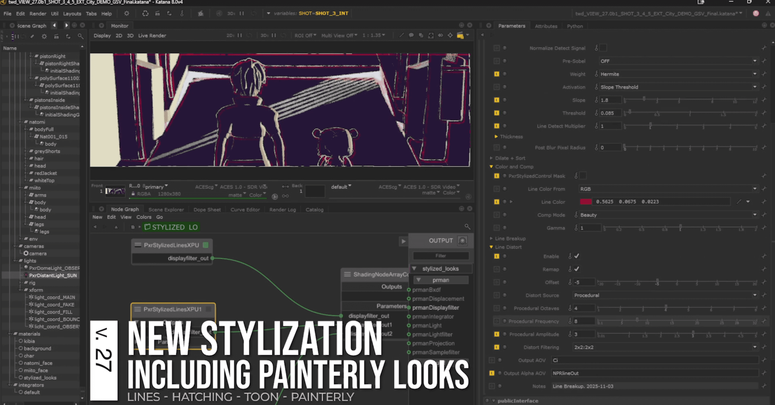 The Stylized Looks suite has matured from experiment to production toolset. It now ships as a unified subsystem under XPU, comprising PxrStylizedControl, PainterlyBrush, Lines, Hatching, Canvas, and Toon filters. Each operates as a display or sample filter, allowing NPR (non-photorealistic rendering) effects such as painterly brush strokes, toon shading, curvature-based outlines, and cross-hatching, all integrated directly with RenderMan’s physically based lighting.