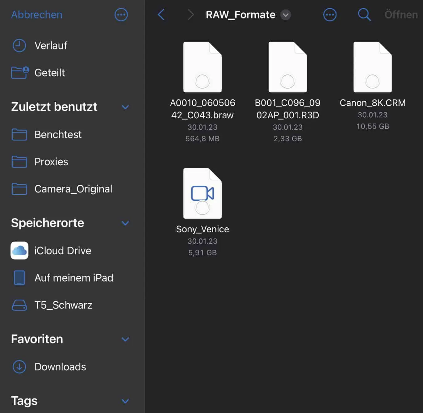 Unfortunately, the disc speed test from Blackmagic (BM for short) is not available for the iPad; we measured with Jazz Disk Bench Pro. The internal SSD managed a full 3 Gbps when reading and 1.36 when writing. A fast, external SSD with Thunderbolt achieved 2.4 Gbps read and 1.2 write. But even an inexpensive SSD with USB-C should be completely sufficient, a Samsung T5 read 360 Mbps and wrote 164. Incidentally, the same SSDs on the laptop with the BM test achieved slightly higher values, so the data cannot be fully compared. Unlike with Mac OS or Windows, data carriers do not have to be logged off here, but logically they should not be in use when pulling the plug. Don’t leave them connected all the time either, as SSDs can drain the battery over 1-2 days.