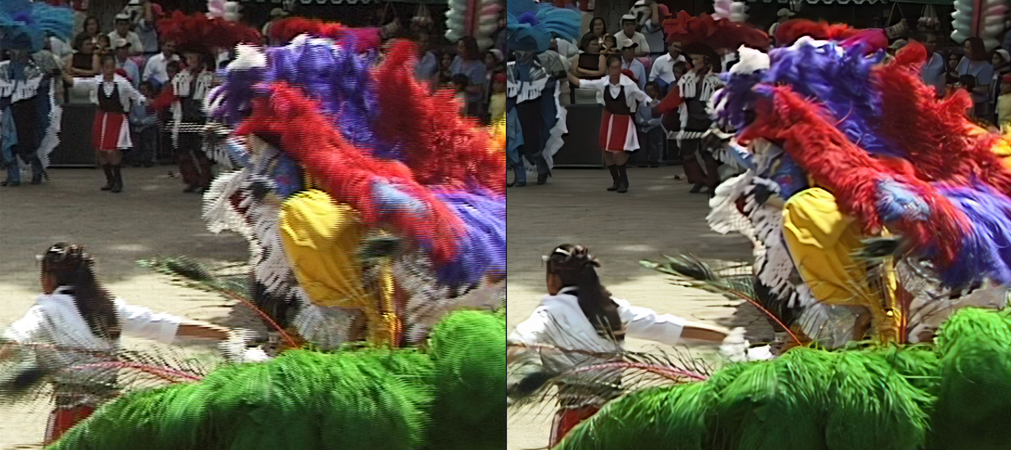 pure de-interlacing, which should achieve real time on more powerful hardware than ours. Even though TVAI can now use all GPU families, it is primarily at home on Nvidia. For comparison on our computer: Creating a quadruple slow motion from the clip of the Mexican carnival took an hour and 45 minutes with TVAI. SpeedWarp and SuperScale took 6 minutes and 23 seconds. The visual result was by no means so drastically superior.