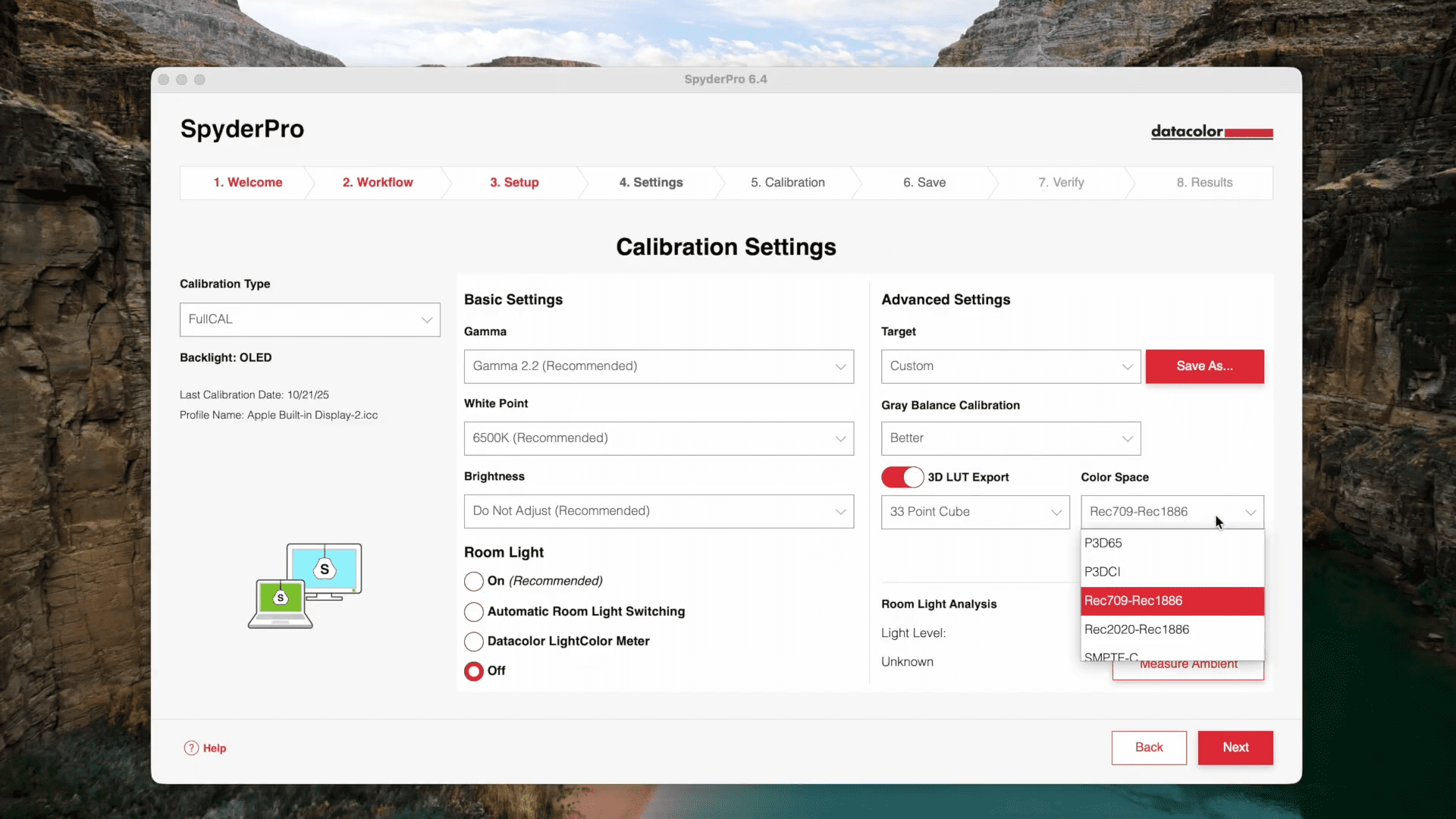 The calibration software is very easy to operate, in simple steps from left to right. You just need to know the backlight technology of your screen and your intended target. The biggest strength is flexibility: you can handle all current technologies, from pretty old CCFL all the way to OLED and QD-OLED. If you are not sure about your screen, check here. Maximum brightness should be no issue either. The top model, the SpyderPro, can measure up to a value we’d rather not like to look at without sunglasses: 12.000 nits.