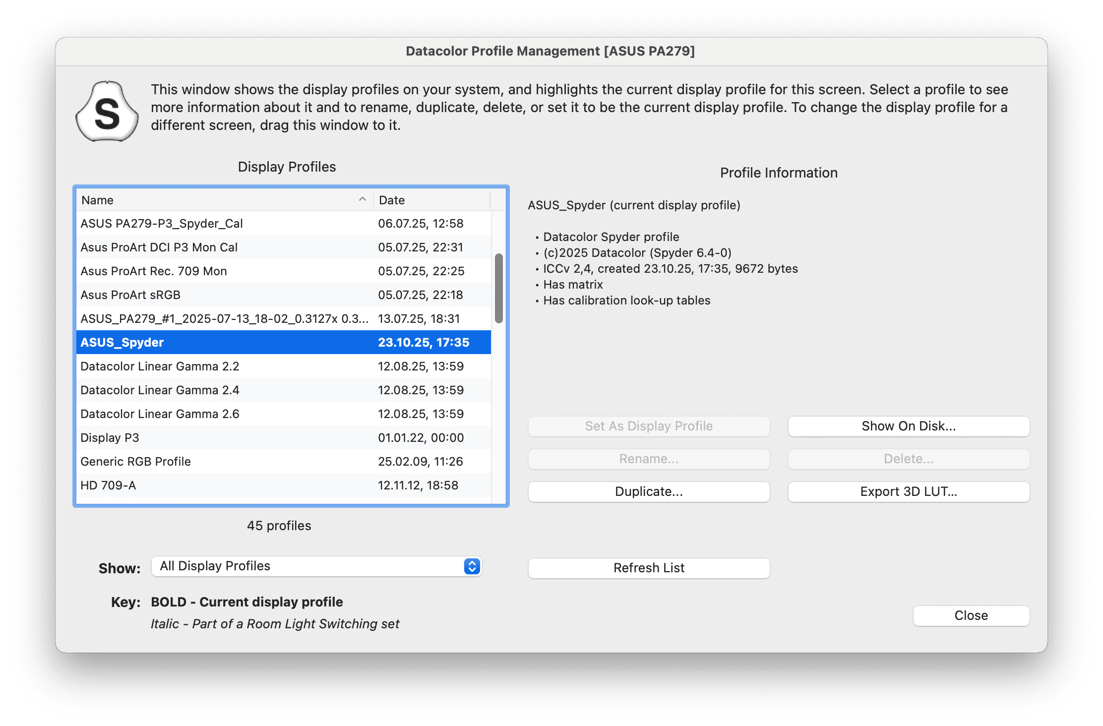 A more helpful menu item is installed with SpyderPro, called SpyderUtility. It will monitor the light level of your environment, if a Spyder is connected and check if the date for your next calibration is due, and inform you accordingly. Its detailed profile information and management can be very helpful, since ICC profiles are usually buried deep in your system folders. Any of those can be activated here, and also renamed or deleted if they were made by you (but not by Apple or Adobe). You can even export a 3D LUT from any of these, albeit only in the most frequently used 33 points lattice.