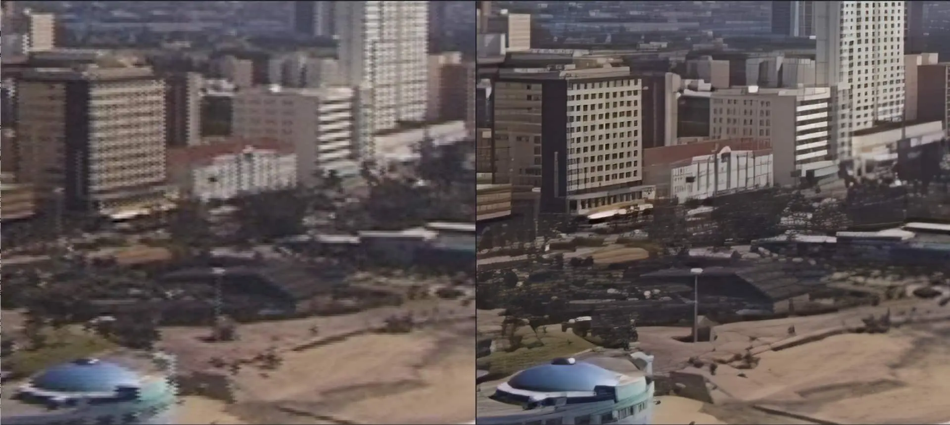 What came out of our DVCAM source in HD is quite impressive. It was not a drone shot (which did not exist for civilian purposes at the time), but a handheld camera in a helicopter. No other de-interlacer was able to handle the particularly critical parallel line structures on the buildings like TVAI. Only in the case of short, fast vibrations did the motion blur prevent an optimal reconstruction of the contour lines. However, a trial with scaling to UHD led to results with a manga look.